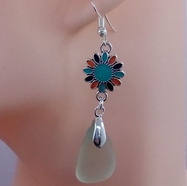 The glass is drilled by hand. The earrings are a silver plated fishhook design.