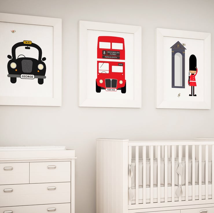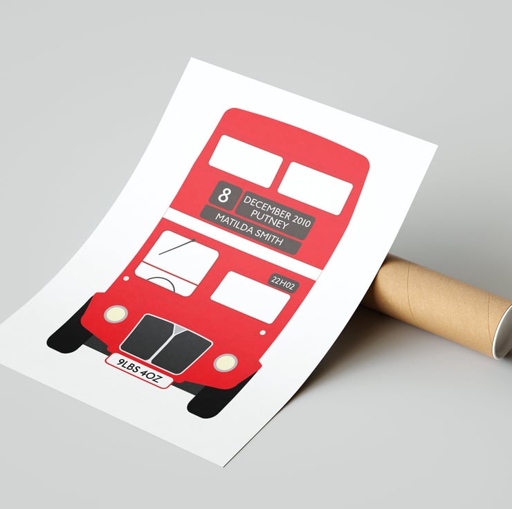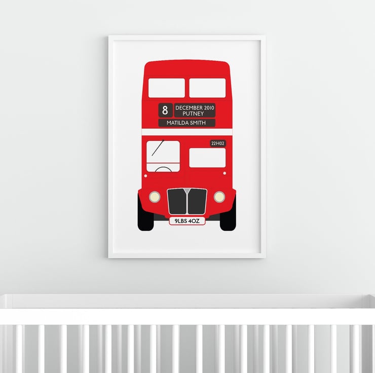 Celebrate a new arrival with this charming personalised London bus print. Featuring the iconic red double-decker, this unique artwork can be customised with a baby's name, birth date, weight & time, making it a perfect keepsake. Of course if you prefer actual bus route information, perhaps from a place close to your heart, we can do this too.
