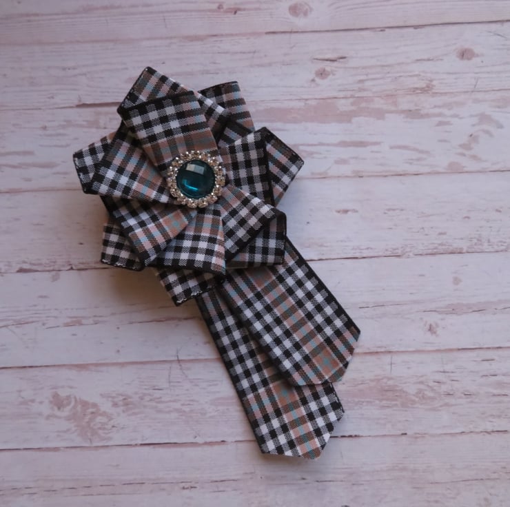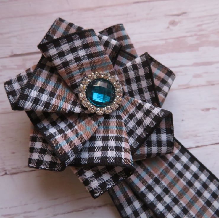 Created with a handmade and sewn ruffle of rare Burns tartan ribbon (white, black pale mocha & turquoise/ aqua line) with wide ribbon shaped trails and finished with a small round teal crystal with diamante stud.