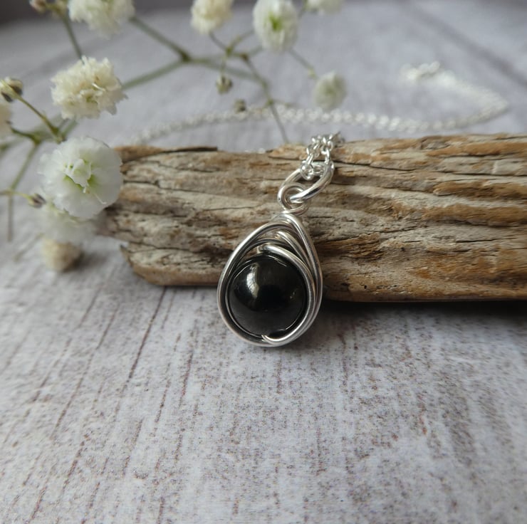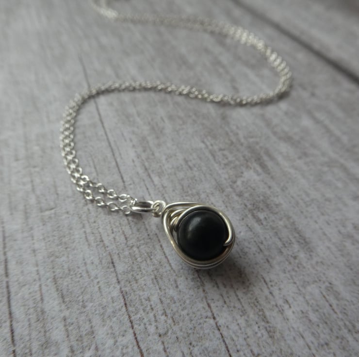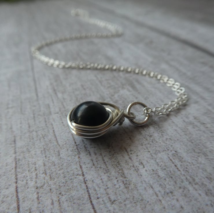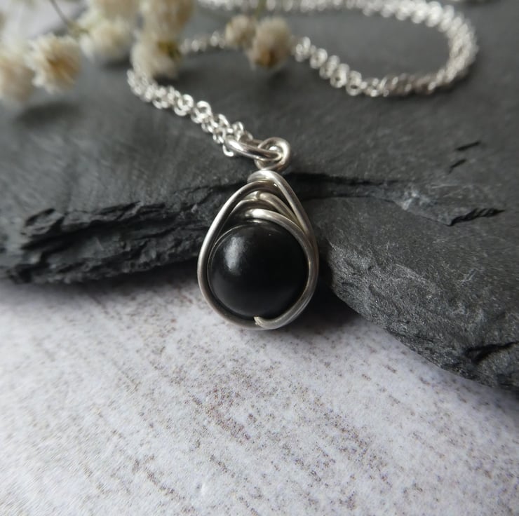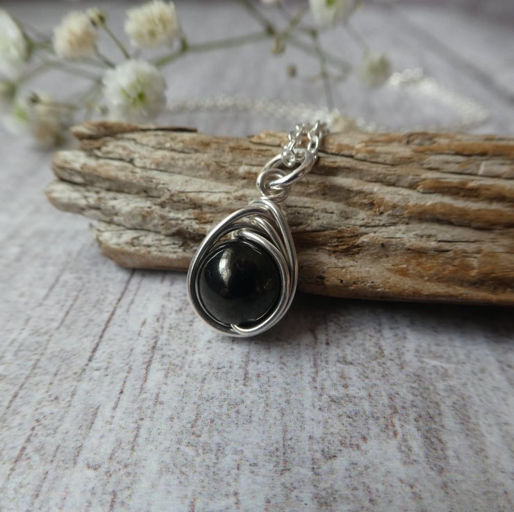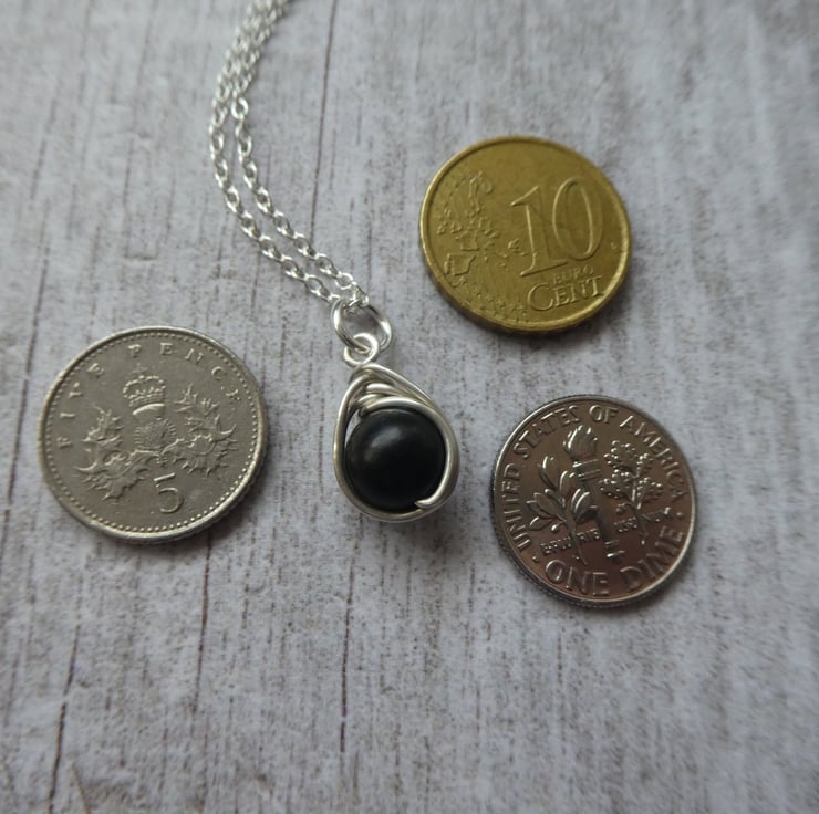 This pretty pendant has been made from an 8 mm jet bead, hand wrapped in a delicate knot work of sterling silver wire, reminiscent of a celtic knot. It finished with an 18 inch sterling silver trace chain, ready to wear or gift. This beautiful black jet is perfect for coordinating with dark colours. This pendant is a delicate size, perfect for wearing every day. These particular pendants are approximately 19 mm long to the top of the jump ring by 10 mm wide. Every knot work pendant I make is unique due to the characteristics of natural gemstones and the instinctive way the wire is hand formed around the beads, this makes each one I make extra special. For this particular listing I will instinctively choose a beautiful black jet bead and your pendant will be made to order.