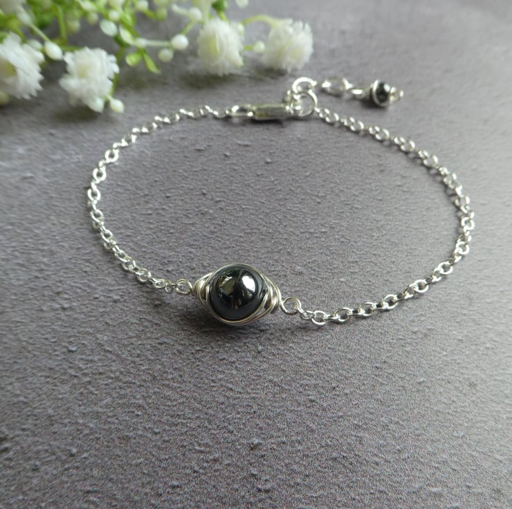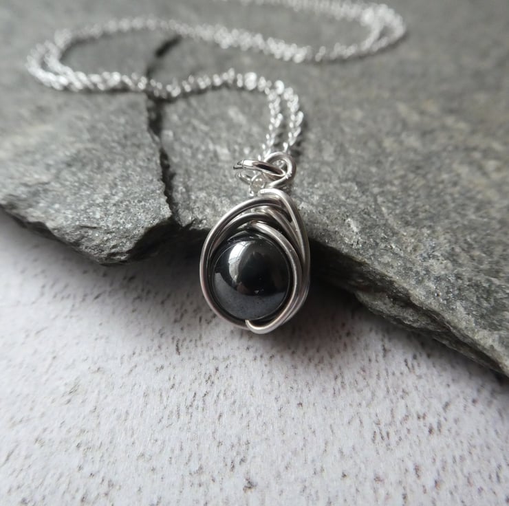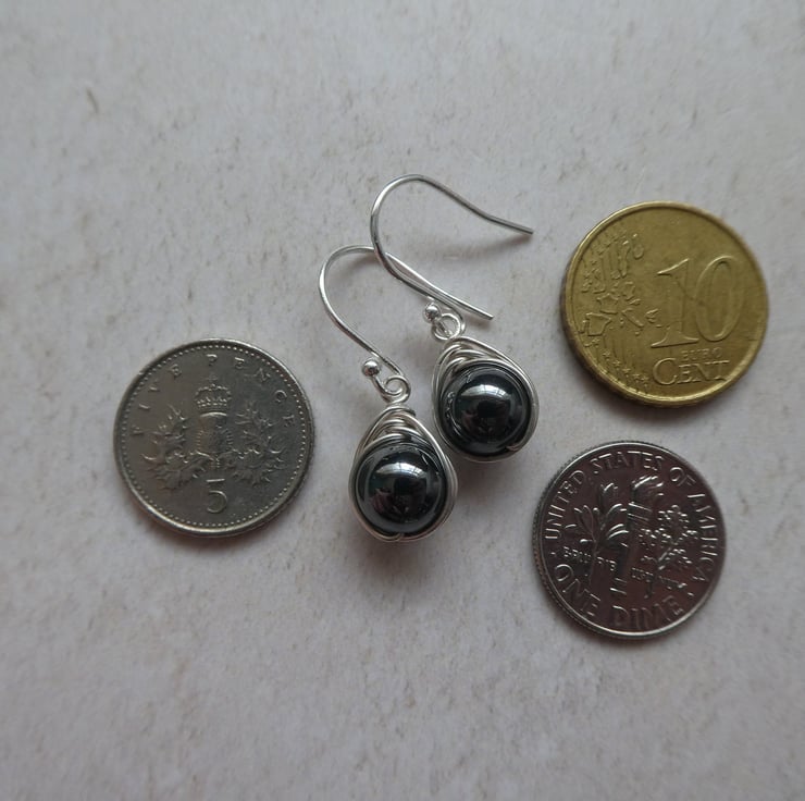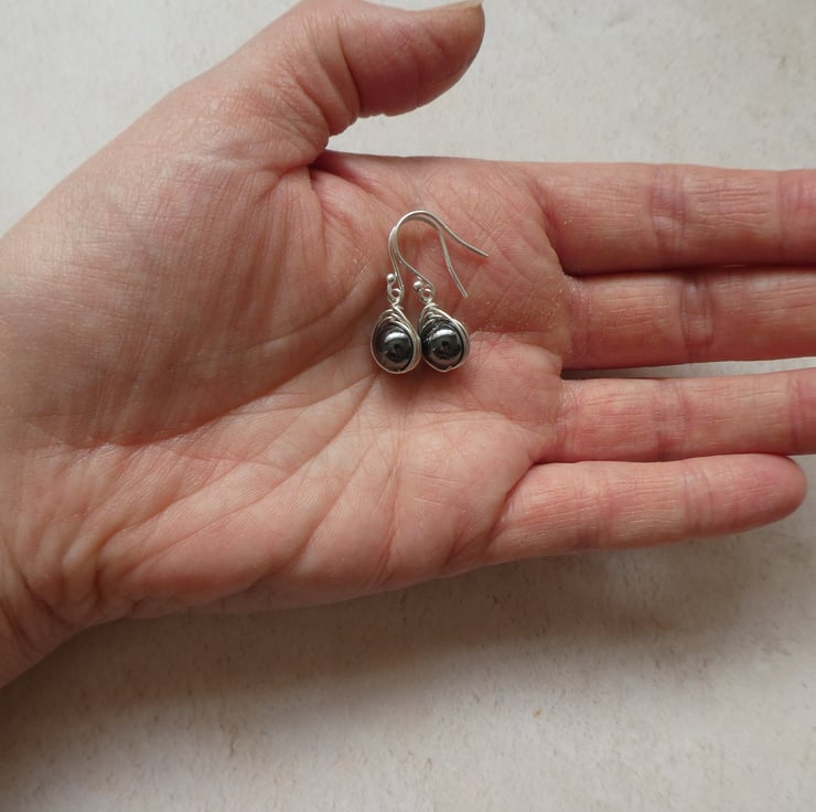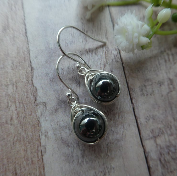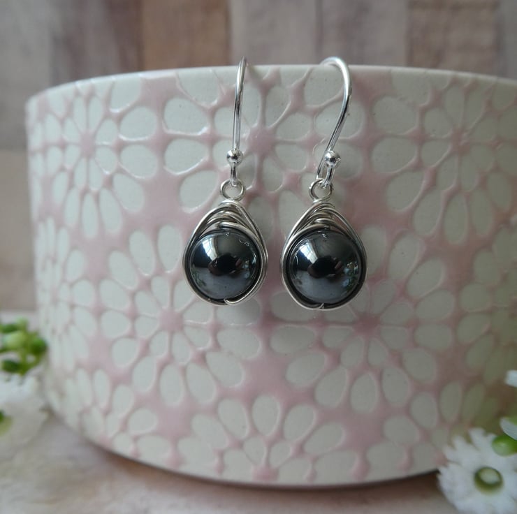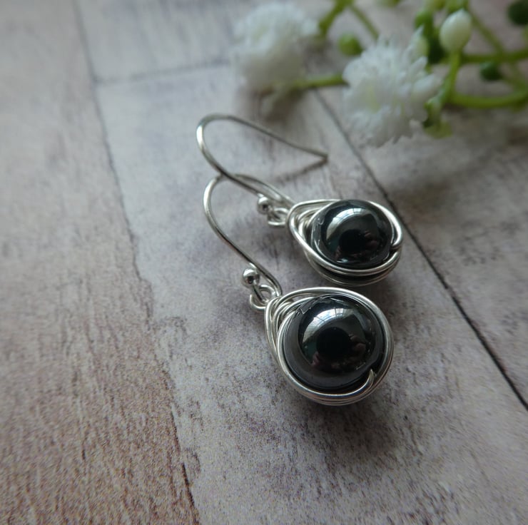 These pretty earrings are made from 8 mm non-magnetic hematite beads, hand wrapped in a delicate knot work of sterling silver wire and finished with a simple pair of sterling silver ear wires. They are a beautiful gunmetal grey with a subtle glossy finish and a great size of earring for wearing everyday. This style of earring measures approximately 27 mm from the top of the ear wire by 9 mm wide. Please check all sizes carefully as I use close up photography to show the details of my work.