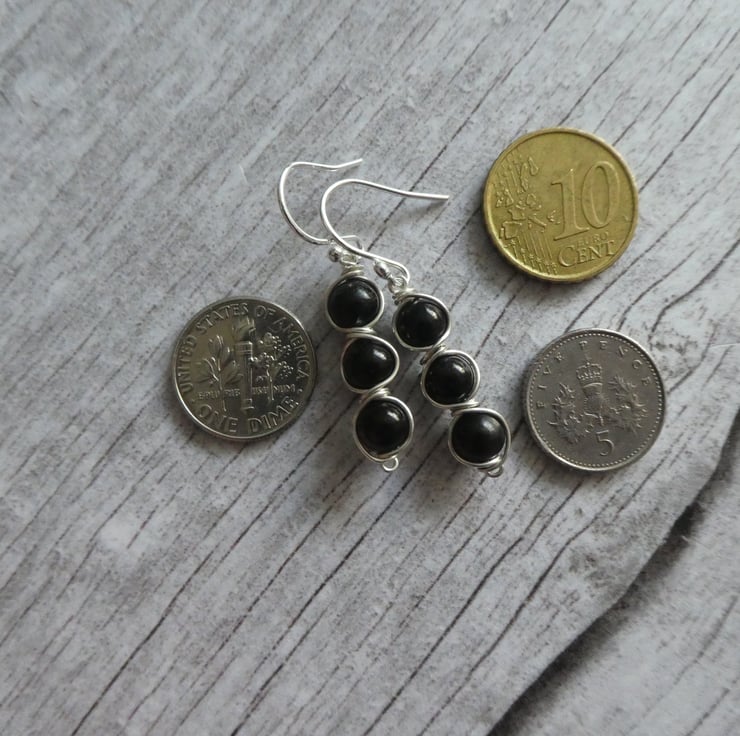 These pretty earrings have been made from a column of 6 mm natural jet beads, hand wrapped in a delicate continuous twist of sterling silver wire which forms a framework around the stones. They are finished with a simple pair of sterling silver ear hooks. Jet is a beautiful. lightweight stone making these earrings ideal for wearing every day.