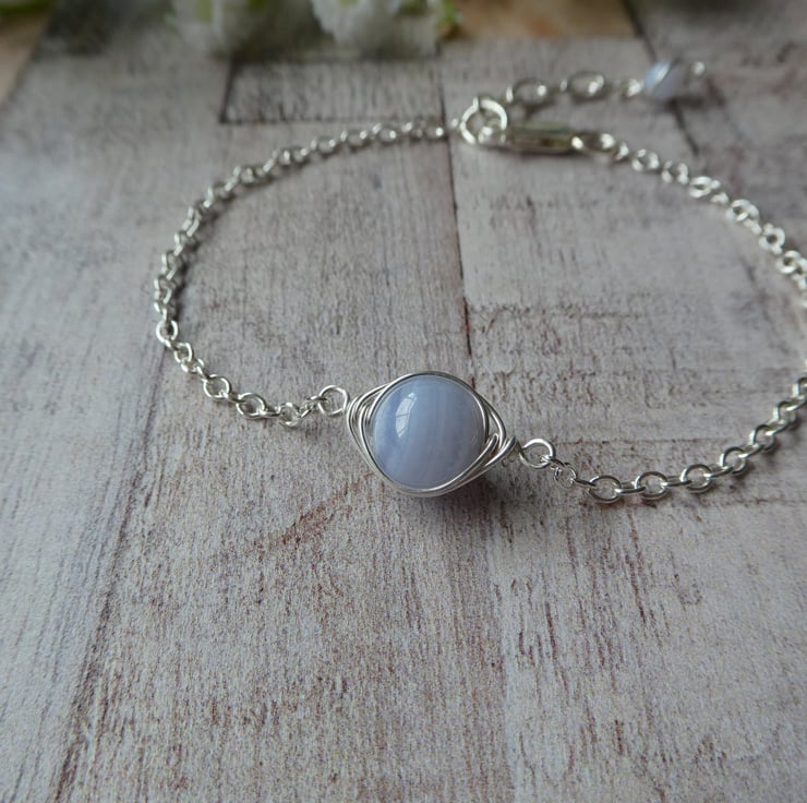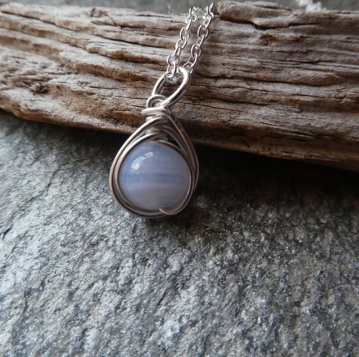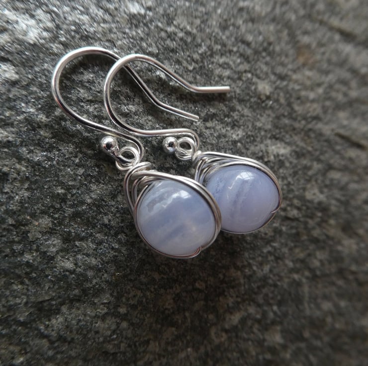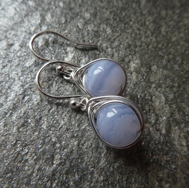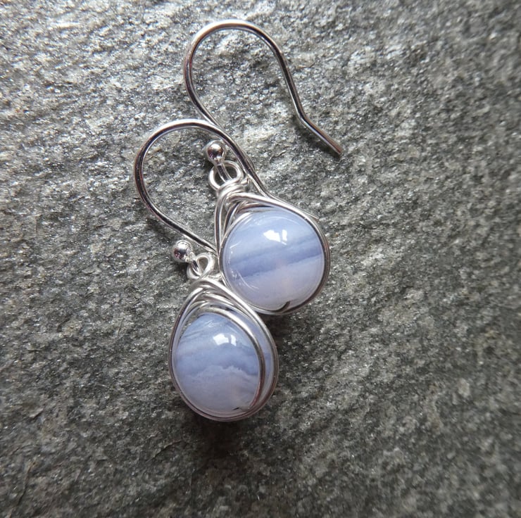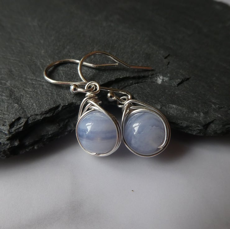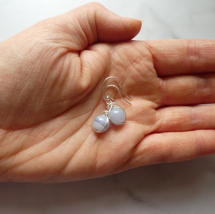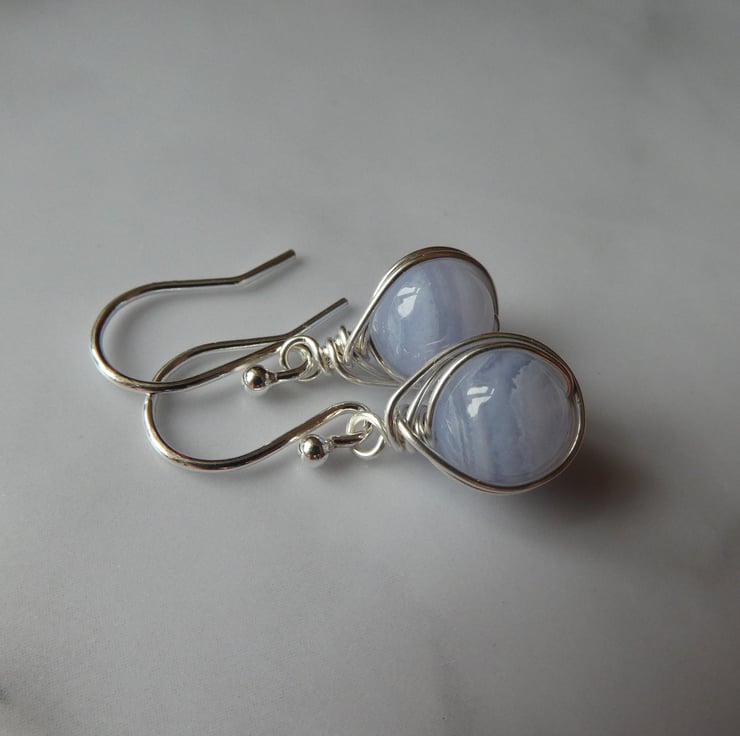 Perfect for every day wear, these pretty blue lace agate earrings are a great introduction to this stunning gemstone. 8 mm blue lace agate beads are delicately hand wrapped in an intricate knot work of sterling silver wire and finished with a pair of simple sterling silver ear hooks. For this listing I will instinctively choose a pair of beautiful beads and your earrings will be made to order. This style of earring measures approximately 26 mm long to the top of the ear hooks by 9 mm wide. Please check all measurements carefully as I often use close up photography to show the detail of my work.