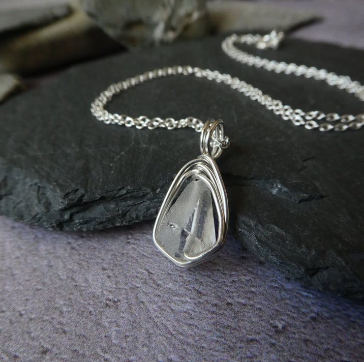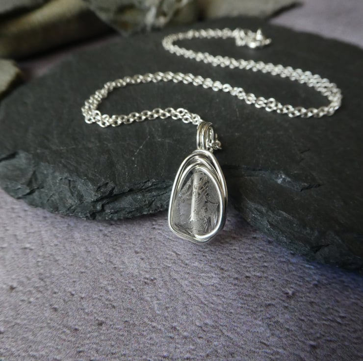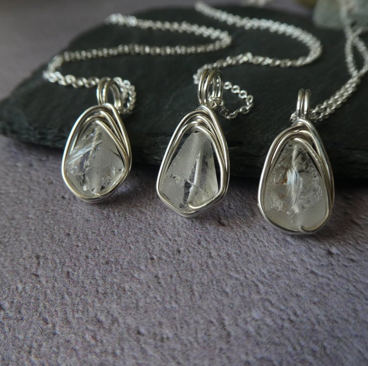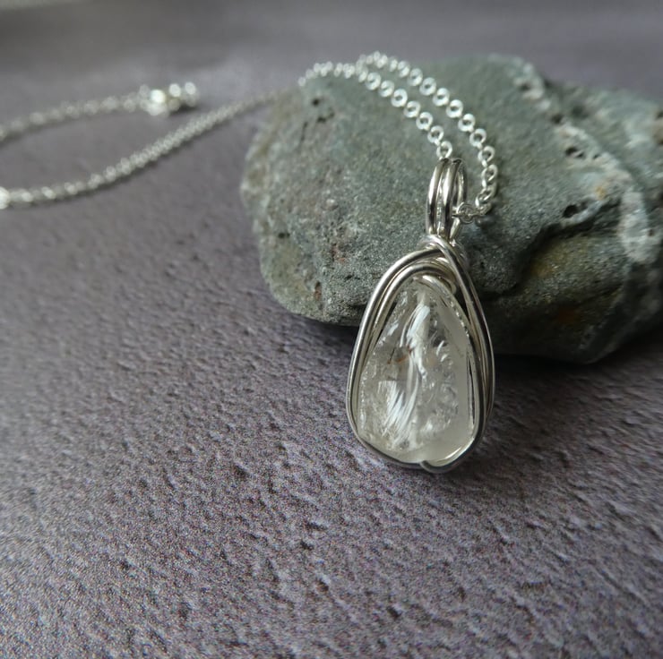 This beautiful, unique pendant is made from a piece of raw, natural clear quartz crystal, intricately hand wrapped in a handmade frame of sterling silver wire. It comes complete with an 18 inch sterling silver trace chain, ready to wear or gift. This listing is for a SINGLE raw quartz pendant, I will instinctively choose a beautiful specimen from my collection of handmade pendants and it will be ready to ship within 2 working days. I have hand selected these rock crystal quartz specimens for their pleasing shapes and unusual surfaces- they have a mixture of clear and frosted looking areas and some have rough faces which catch the light . This style of pendant has a sophisticated but rustic appearance, perfect for someone who prefers their gemstones close to how nature created them. These pendants measure approximately 22 mm to the top of the integrated bail by around 10 mm at their widest point. Sizes are approximate and average as each rough specimen has it's own unique dimensions and shape.