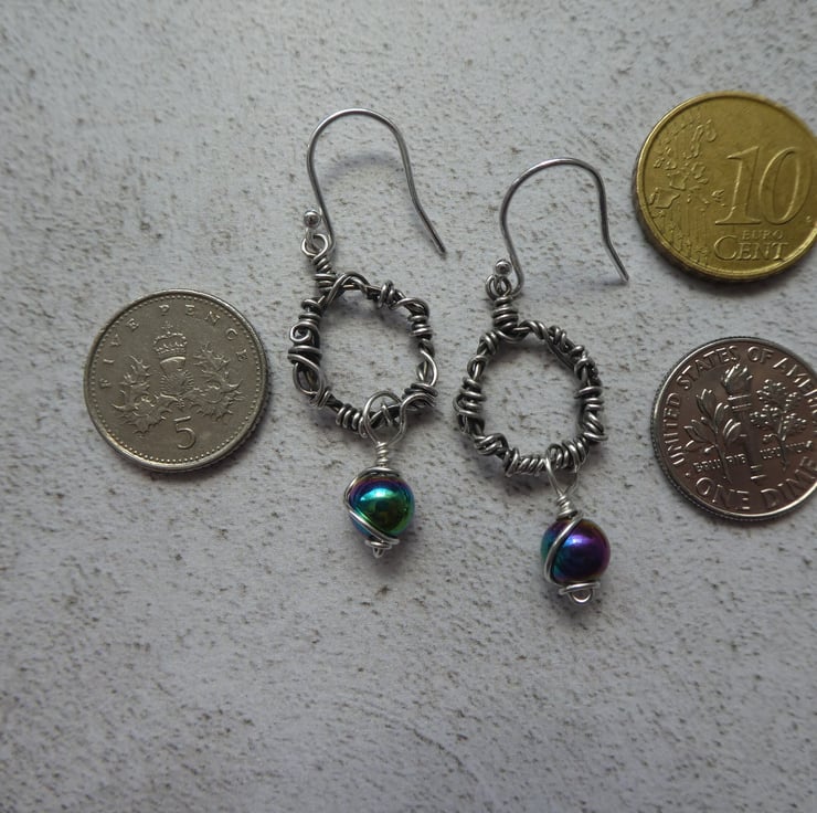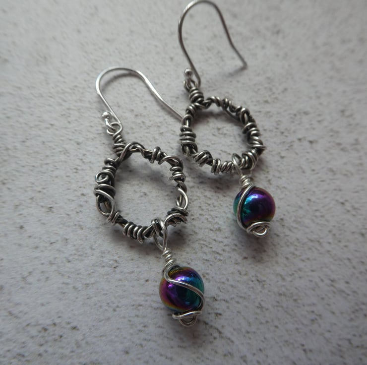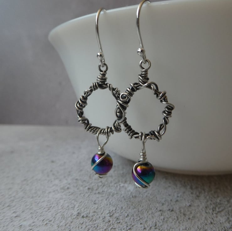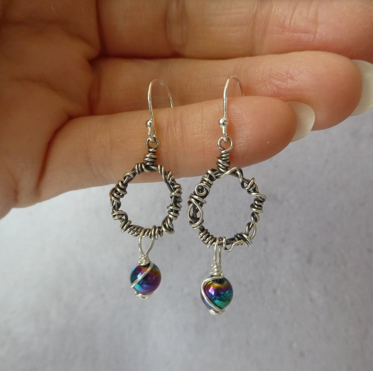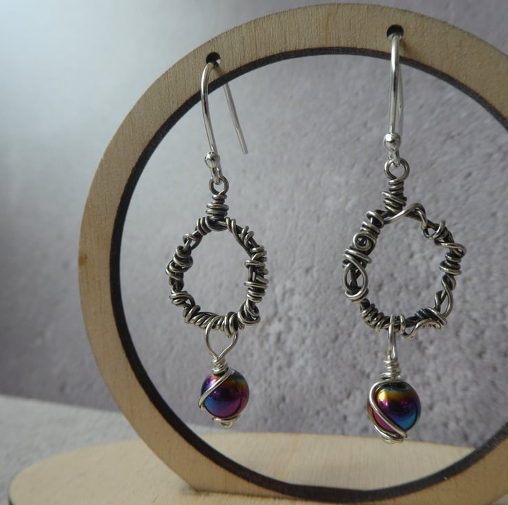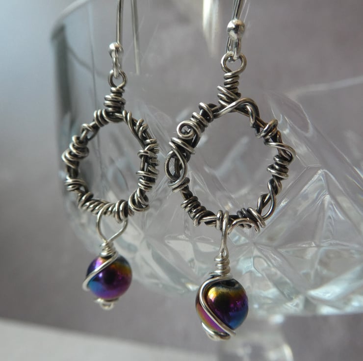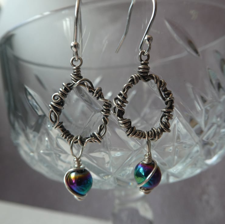 These pretty earrings are made from 6 mm rainbow hematite beads, dangled from handmade sterling silver wire work frames. The surface has been lightly oxidised to darken the silver then hand polished to enhance the detail of the wire work. They are finished with a simple pair of sterling silver ear wires which are NOT oxidised. This pair of earrings are approximately 47 mm long to the top of the ear wires by 14 mm wide. Please check all sizes carefully as I often use close up photography to show the detail of my work. For this particular listing you will receive the exact pair shown in the photos which are a one-off.