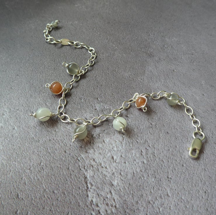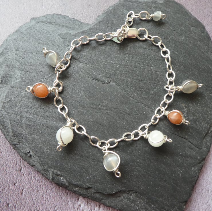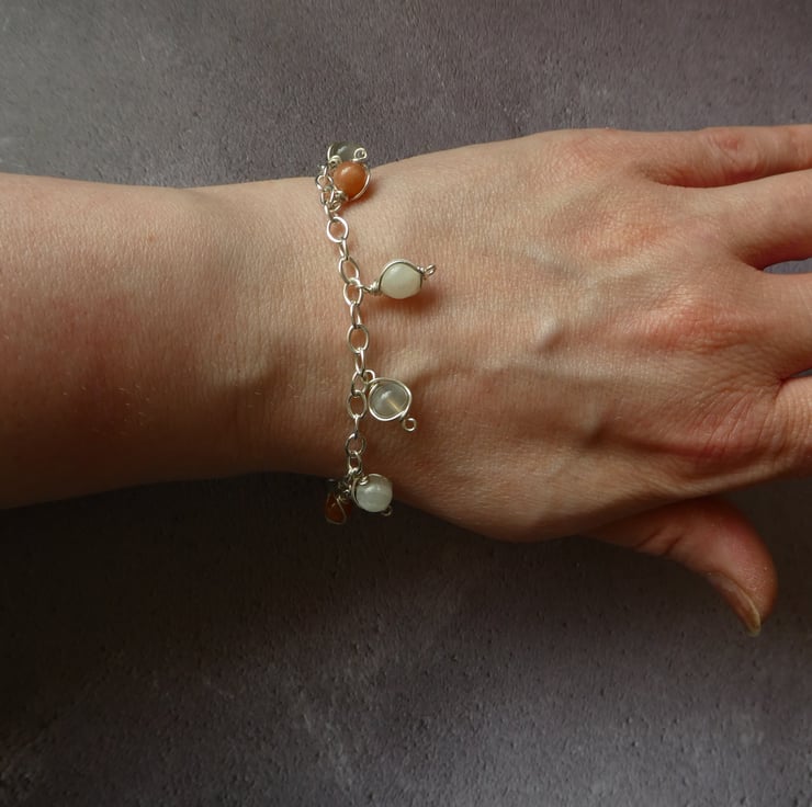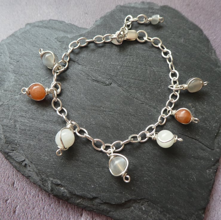 This pretty charm style bracelet features seven 6 mm moonstone beads, intricately hand wrapped in individual frameworks of sterling silver wire, dangling from a sterling silver trace chain bracelet. The moonstones are a mixture of colours featuring peach, grey and white tones. The charms are fixed on this bracelet and cannot be removed. It fastens with lobster claw clasp and has a one inch extender chain to adjust the fit. This bracelet comes in a pretty ribbon wrapped gift box. For this listing I have instinctively chosen a selection beautiful natural moonstone beads and a bracelet is already made and ready to ship. This style is approximately seven and a half inches (19cm long), with a one inch extender chain.