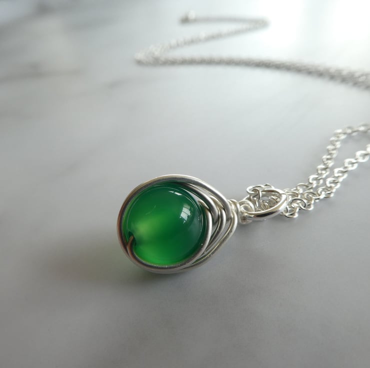 This pretty pendant features an 8 mm green onyx bead, intricately hand wrapped in pretty knot work of sterling silver wire reminiscent of a celtic knot. It is finished with an 18 inch sterling silver trace chain, ready to wear or gift. For this listing I will instinctively choose a beautiful green onyx bead and your pendant will be made to order and ready to ship within 2 working days. Due to the instinctive methods of hand wrapping, each pendant I make will vary slightly from the illustrative photography. These pendants are approximately 19 mm long including the jump ring by 10mm wide. Please check all sizes carefully as I often use close up photography to show the detail of my work.