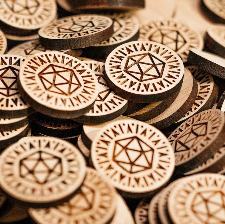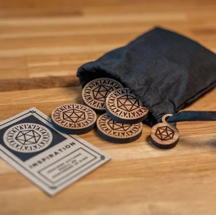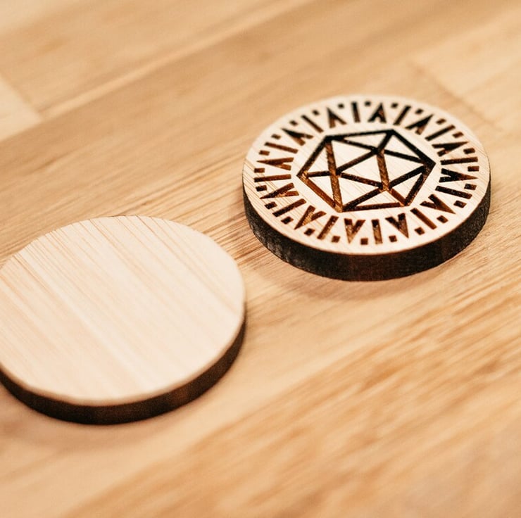These helpful tokens are a neat way to keep tabs on players inspiration in game. Hand one over to your adventuring buddies and they'll never forget to use that bonus in a bind! Made of beautiful, sustainable bamboo, and engraved with our D20 Inspiration design. Each token is 3.5cm x 3.5cm. These come as a set of 6, which should suit the needs of an average sized adventuring party. A useful and stylish addition to your RPG toolkit!