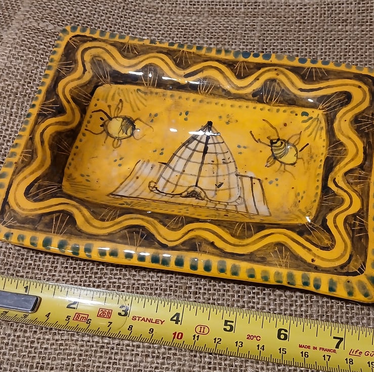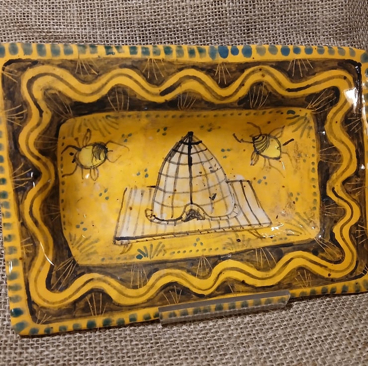 Square dish made from terracotta earthenware, hand decorated with a medieval bee skep design.