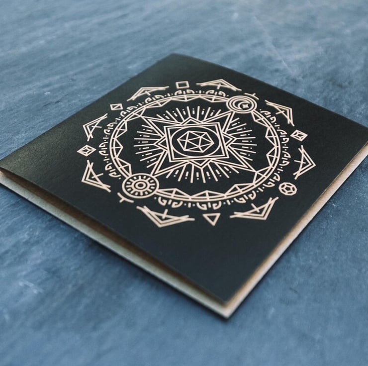 A pack of 5 greetings cards featuring our 'Compass of Fate' design, on lovely 300gsm recycled cardstock. Matching recycled envelopes are supplied.