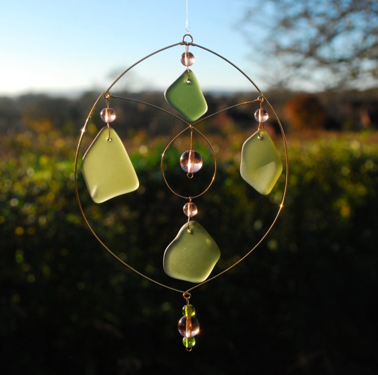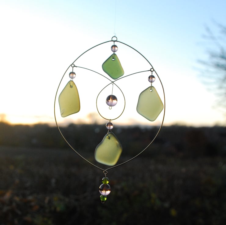 Our sun catchers are individually hand made in Chudleigh, Devon. We collect our materials ourselves, mainly from local beaches. Each piece of glass is unique, so each sun catcher is unique.