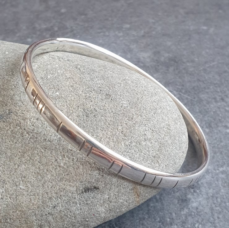 Sterling silver bangle made from 5.7mm X 3.0mm oval wire, in a large 70mm diameter size with notched texture and round shape, as discussed.