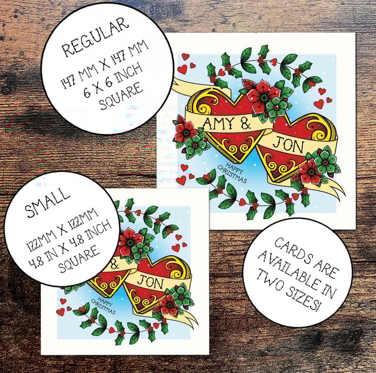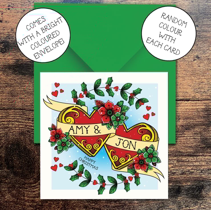 A unique and personal way to send your festive love to any couple, this tattoo and folk art inspired, hearts and flowers Greetings Card featuring holly, berries and snow is the perfect choice! Made with care, this card features a stunning tattoo style artwork that can be customised with personal names to send your Christmas greetings.