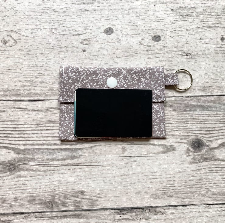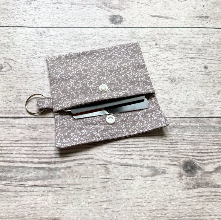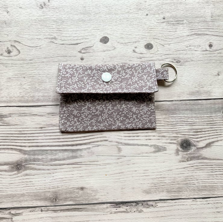 Grey ditsy themed cotton fabric card holder with matching lining a layer of interfacing in between the fabric. It features a snap closure to keep your items secure and a keychain to attach to your bag.