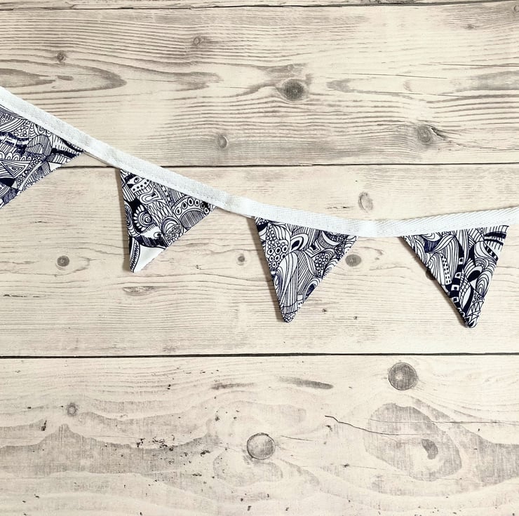 Please keep away from children, pets and fire. Bunting is intended for decorative purposes only and is not a toy. Fabric has not been treated by me to be fire retardant, so should be kept away from lit fires and electrical items, particularly sources of heat, like lights. Ensure bunting is tied / pinned up / weighed down securely, as could pose a strangulation risk. Keep out of reach of children and pets. Bunting is intended for indoor use. If used outside, it may be prone to weather damage. Cold hand wash only.