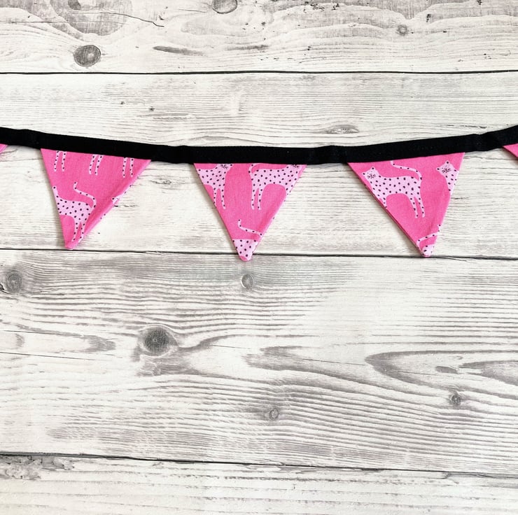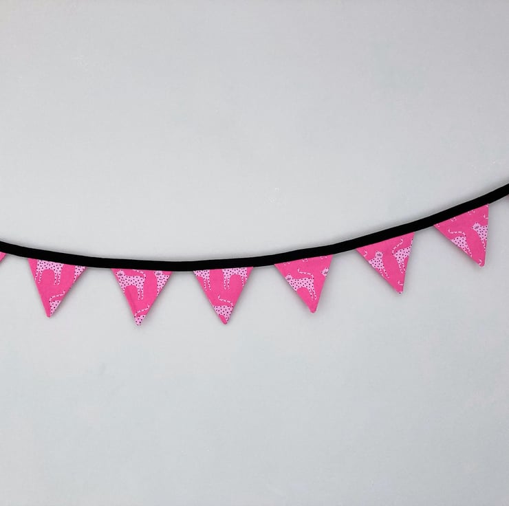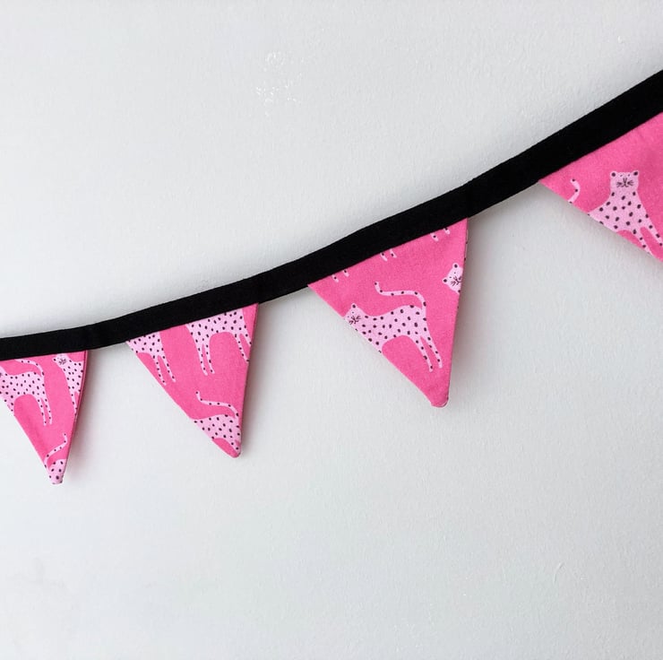 Beautifully handmade mini bunting. It features 8 pink cotton flags with leopards, sewn onto a black tape.