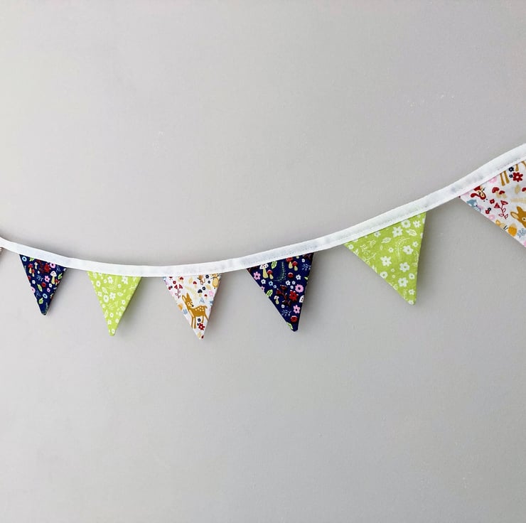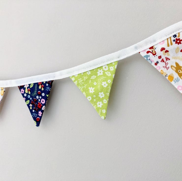 Beautifully handmade mini bunting. It features 7 cotton flags with woodland theme prints sewn onto white cotton tape