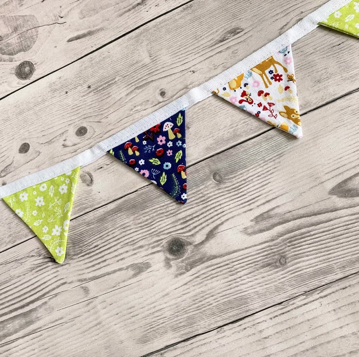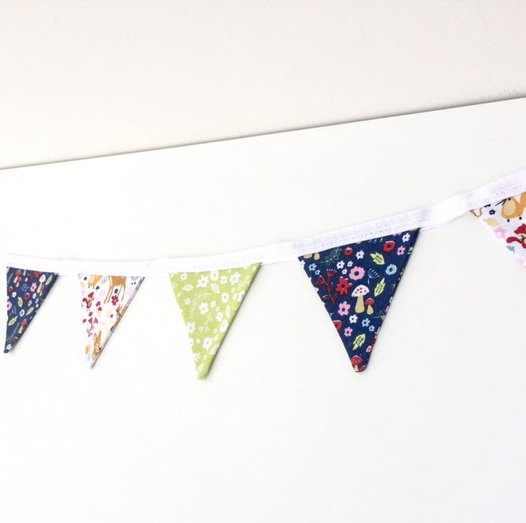 Beautifully handmade mini bunting. It features 7 cotton flags with woodland theme prints sewn onto white cotton tape