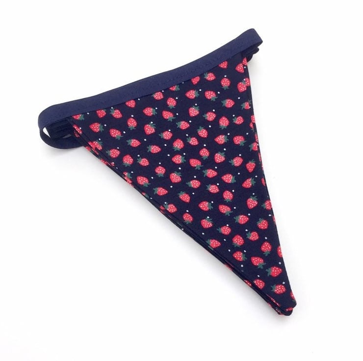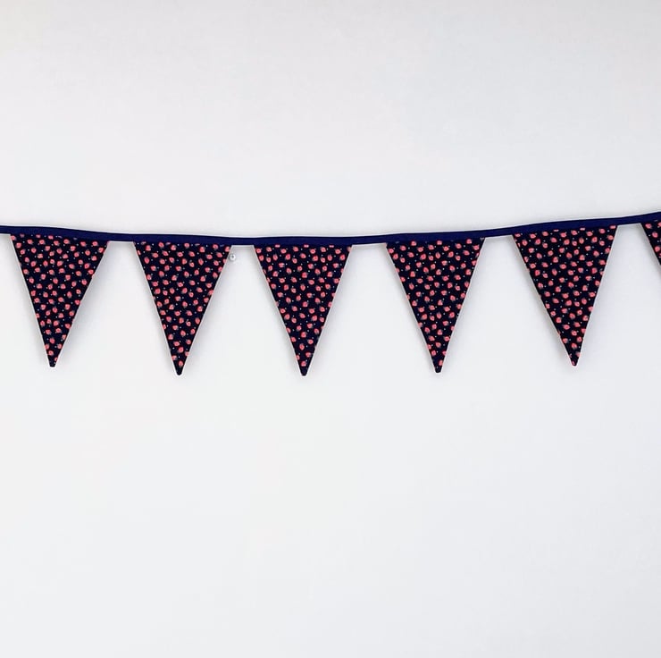 Beautifully handmade Cotton Fabric Bunting. It features 9 flags with red strawberries on a navy blue background, sewn onto blue bias binding.