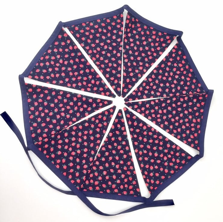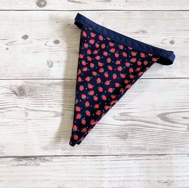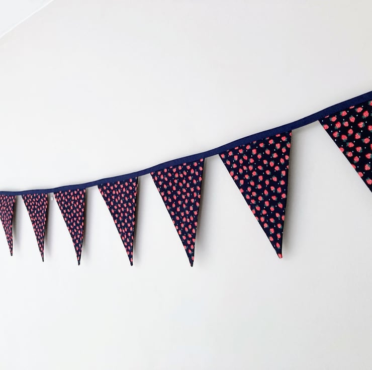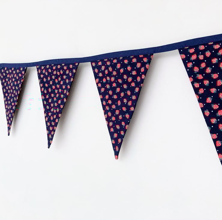Beautifully handmade Cotton Fabric Bunting. It features 9 flags with red strawberries on a navy blue background, sewn onto blue bias binding.