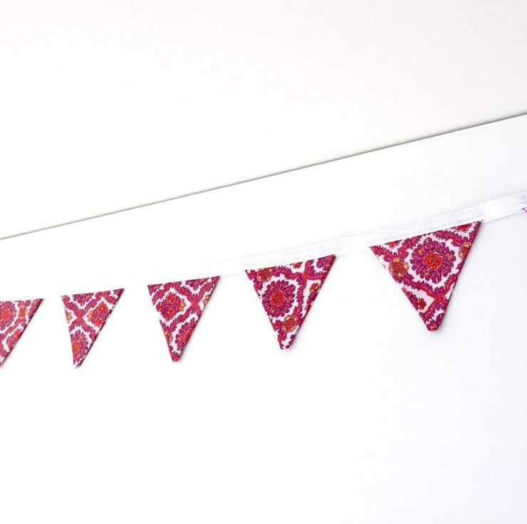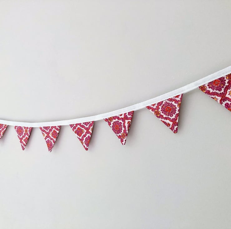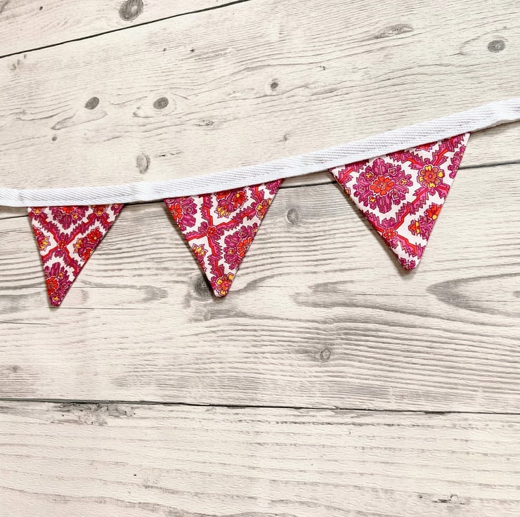 Beautifully handmade mini bunting. It features 8 flags with a pretty pink and white pattern, sewn onto white cotton tape