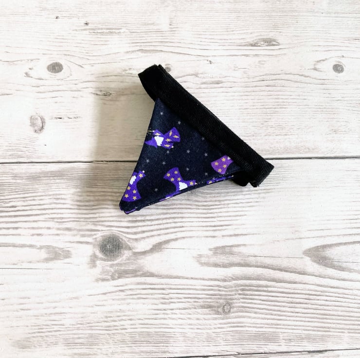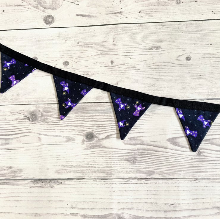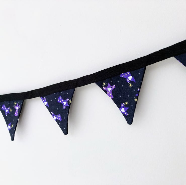 Beautifully handmade mini bunting. It features 8 cotton flags with purple wizards holding a gold wand on a dark grey background with tiny stars, sewn onto black cotton tape.