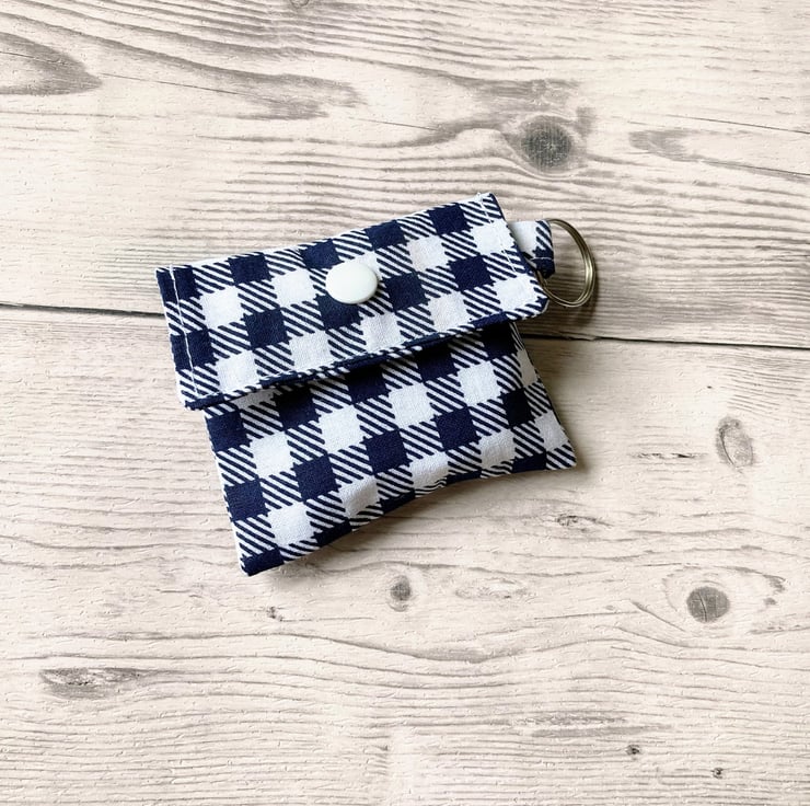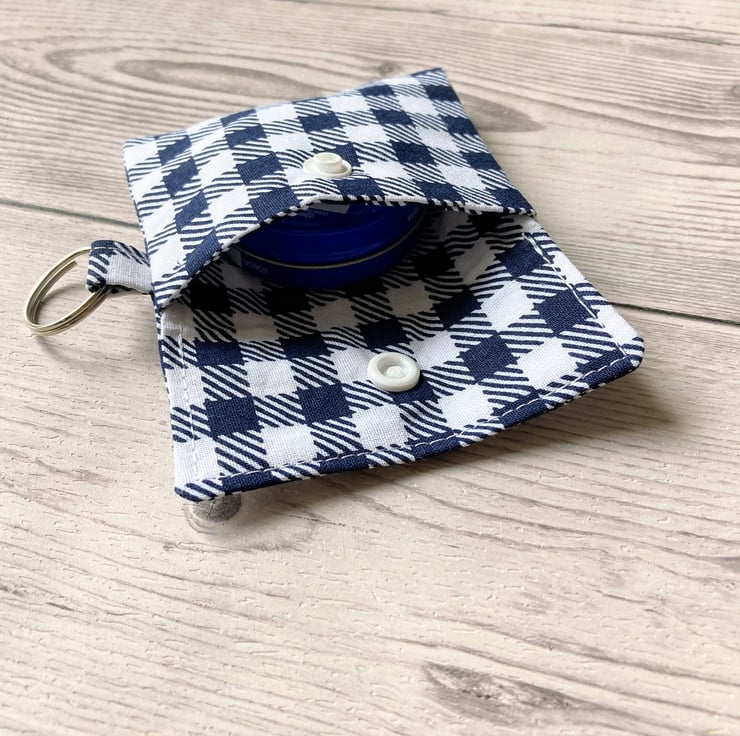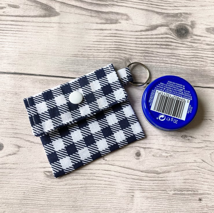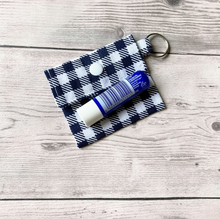 Lip balm keyring for round tins or long tubes. Blue and white checked keychain,.