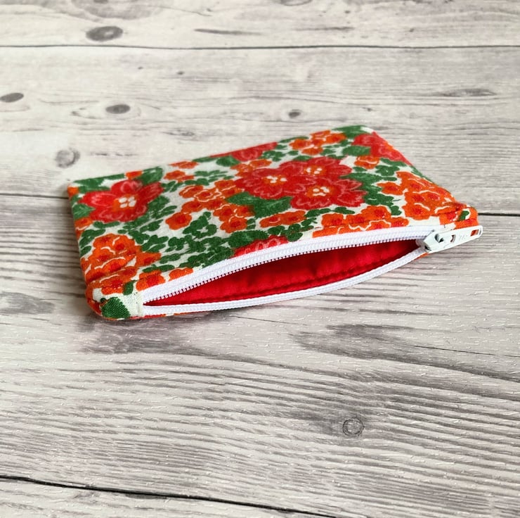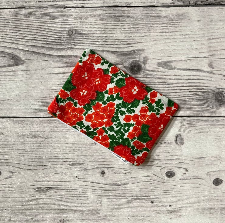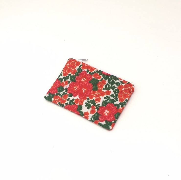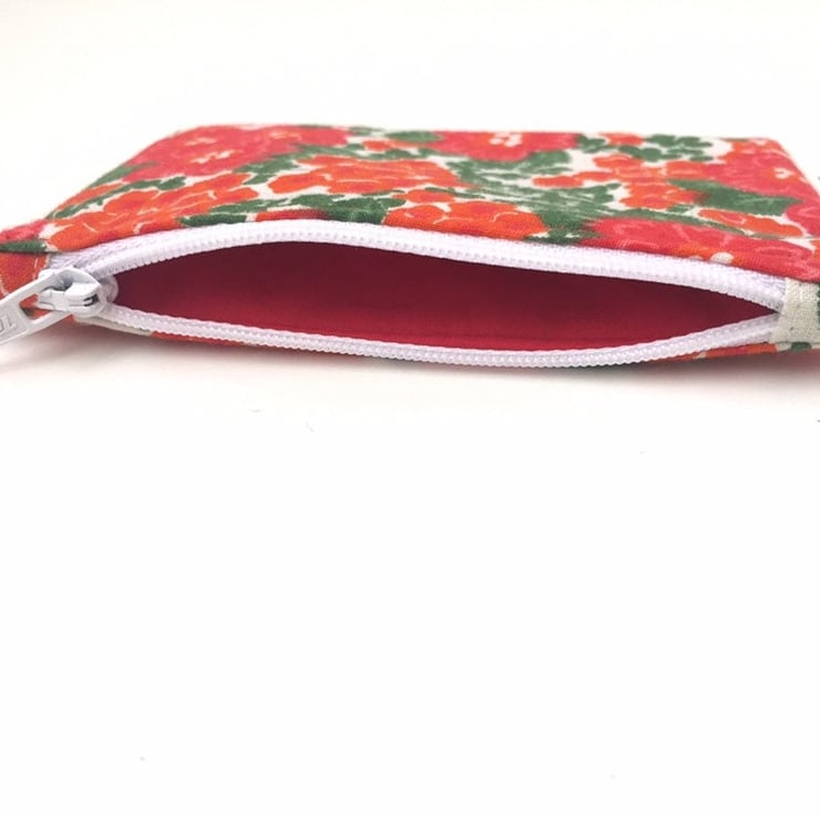 Red and green floral cotton fabric with a Red cotton fabric lining and white zip.