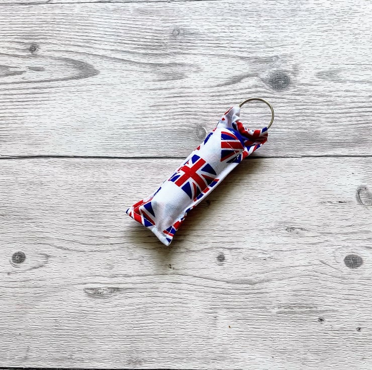 Lip balm, lipstick, keychain in a Great Britain themed polycotton fabric.