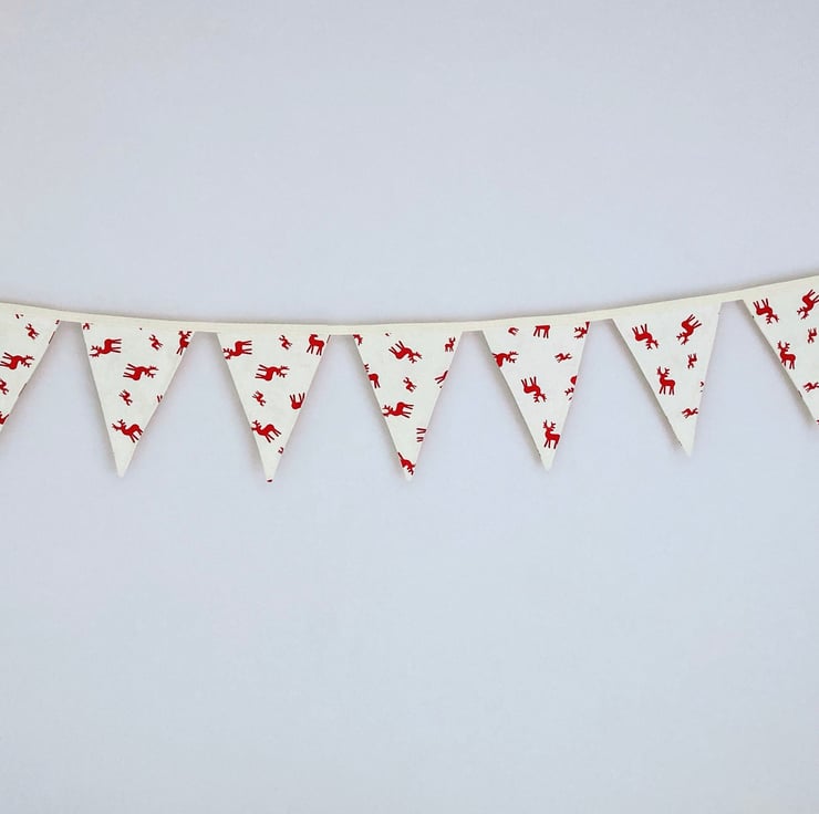 Beautifully handmade Cotton Fabric Bunting. It features 9 flags with red reindeers on a cream background, sewn onto cream cotton tape.