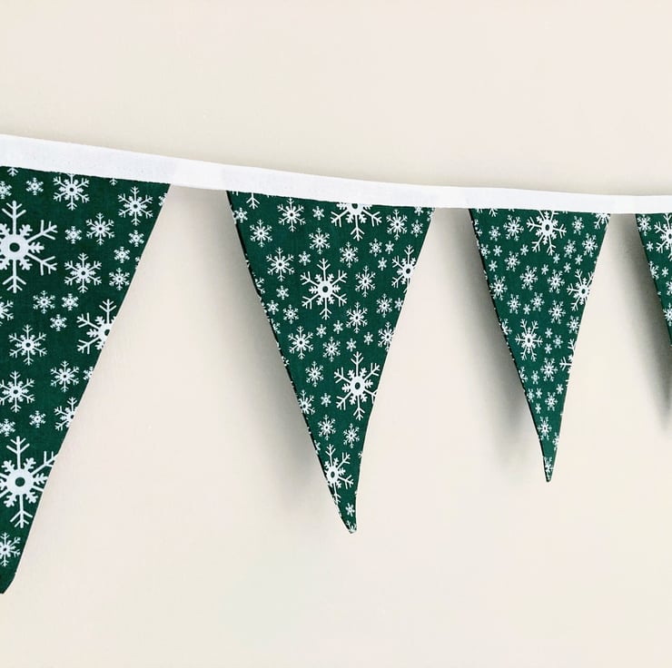 Beautifully handmade Polycotton Fabric Bunting. It features 9 flags with white snowflakes on green, sewn onto white cotton tape.
