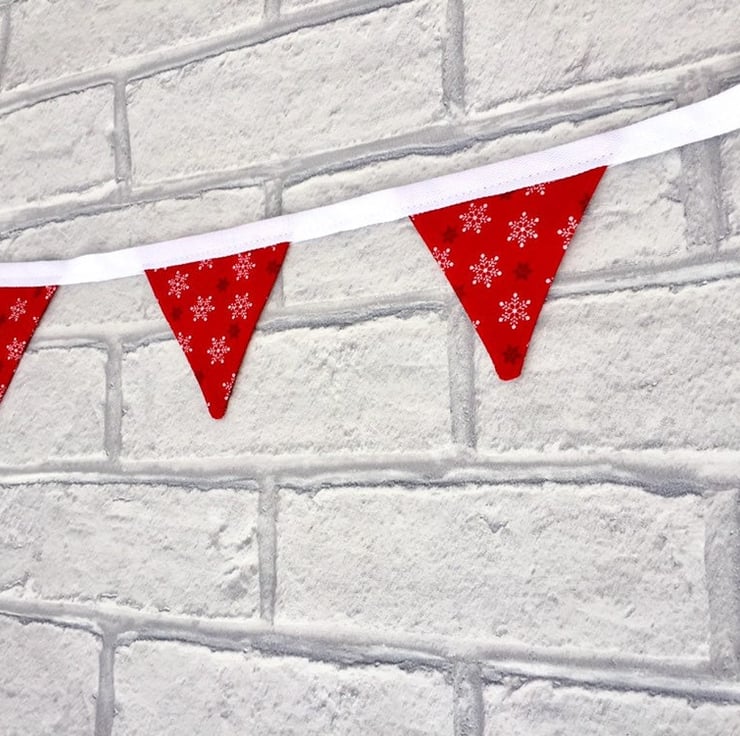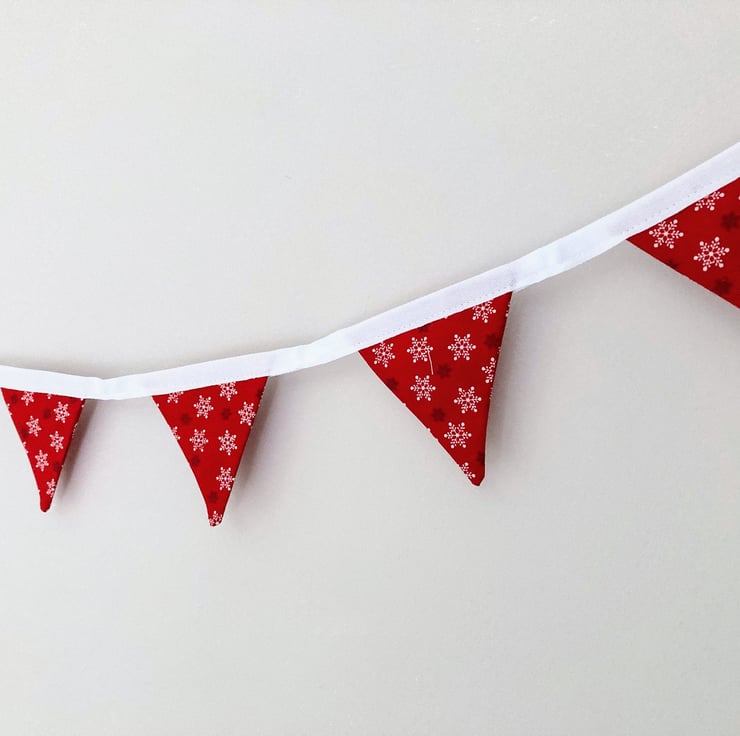 Beautifully handmade mini bunting. It features 8 flags with white and black snowflakes on red cotton fabric, sewn onto white cotton tape