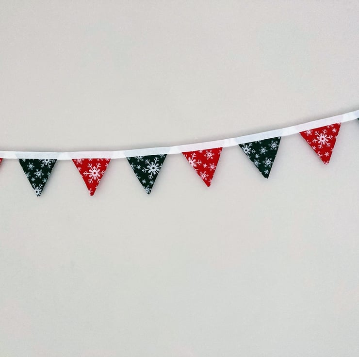 Beautifully handmade mini bunting. It features 8 flags with white snowflakes on red & green, sewn onto white cotton tape