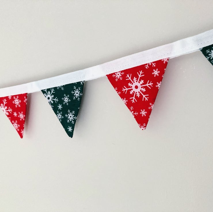 Red and green Christmas double sided fabric mini bunting with white snowflakes.