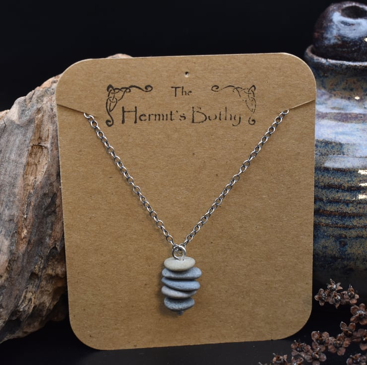 This necklace has been made using recycled sterling silver, and beach pebbles collected locally in the Scottish Highlands. It features five small rounded stone pebbles, centre-drilled and stacked on a handmade sterling silver headpin. All the sterling silver components have been oxidised using liver of sulphur to give an antiqued finish. The pendant comes with a sterling silver trace chain with a bolt ring clasp, in a length of either 45cm (18 inches) or 50cm (20 inches) - please specify when ordering which chain length you would prefer (please refer to length reference photo).