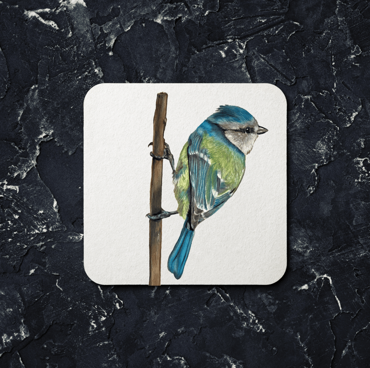 This coaster is a digital print of my original Blue Tit drawing produced in the medium pastel pencil.
