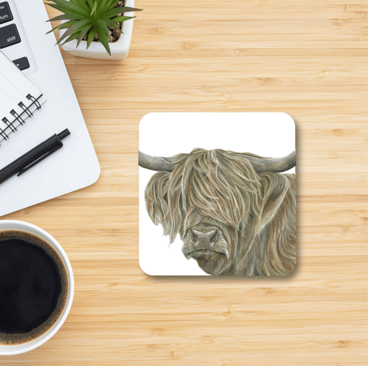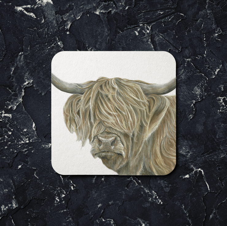 This coaster is a digital print of my original Highland Cow drawing produced in the medium pastel pencil.