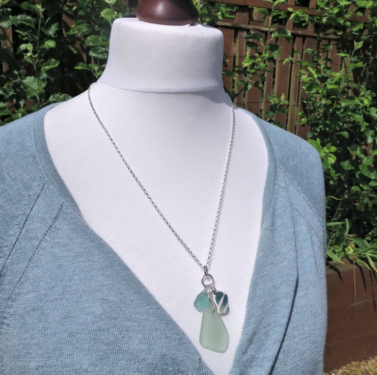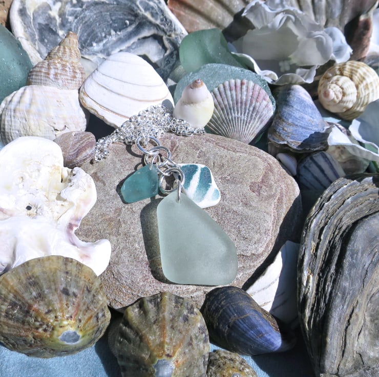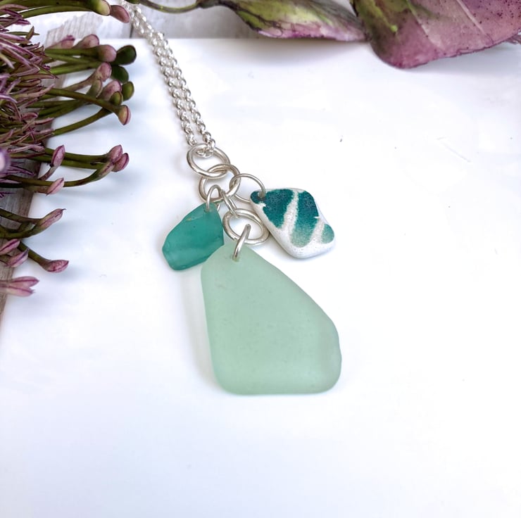 Teal Sea Glass and Pottery Long Silver Necklace, Coastal Inspired Jewellery