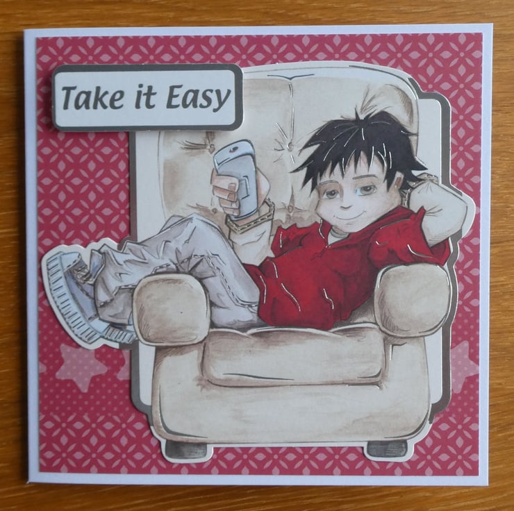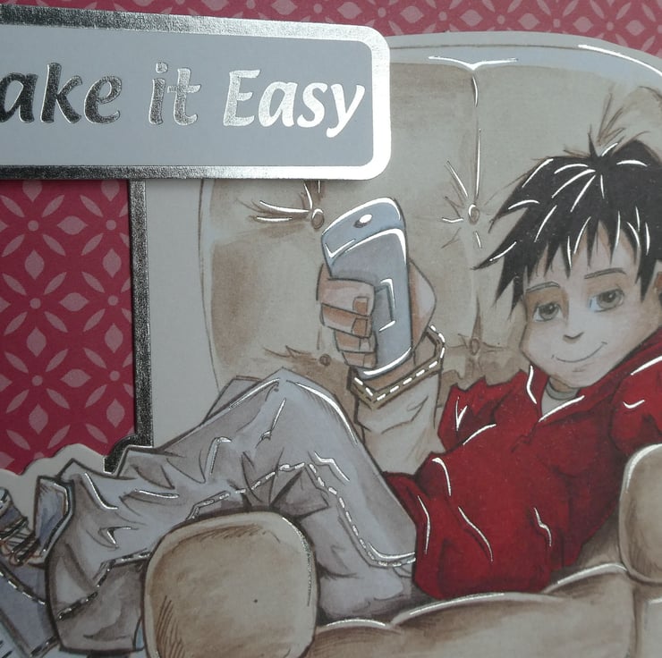 Suitable for a boy or teenager this birthday card has an image of a boy relaxing in an armchair with a remote control and the message Take it Easy.