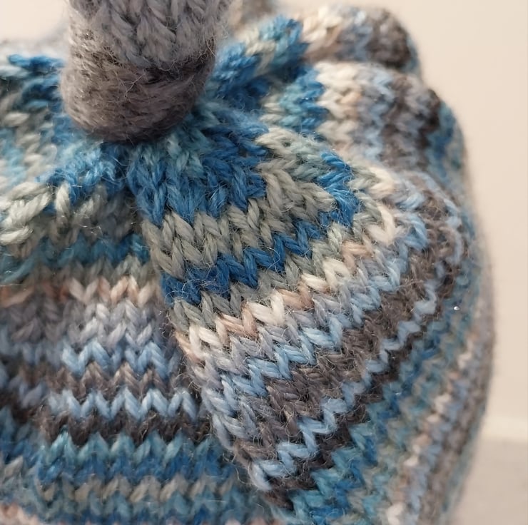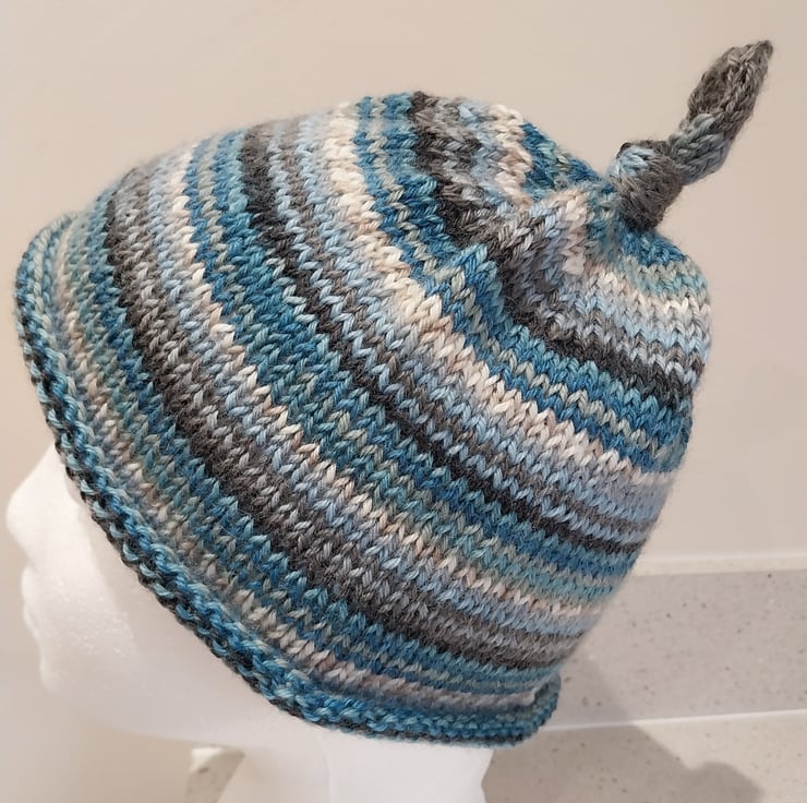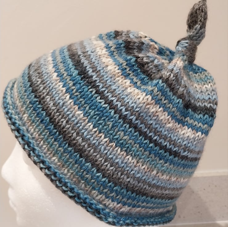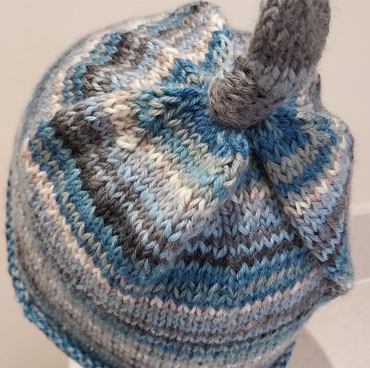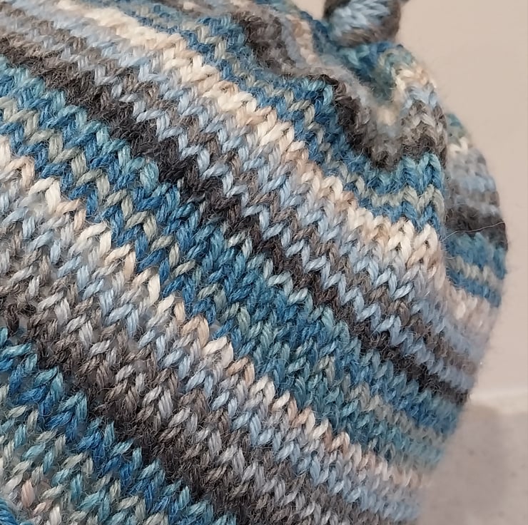 Handknit KNOTTY TOP BEANIE Stripey jacquard blue grey child teen adult small