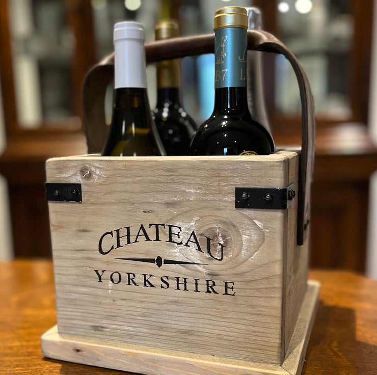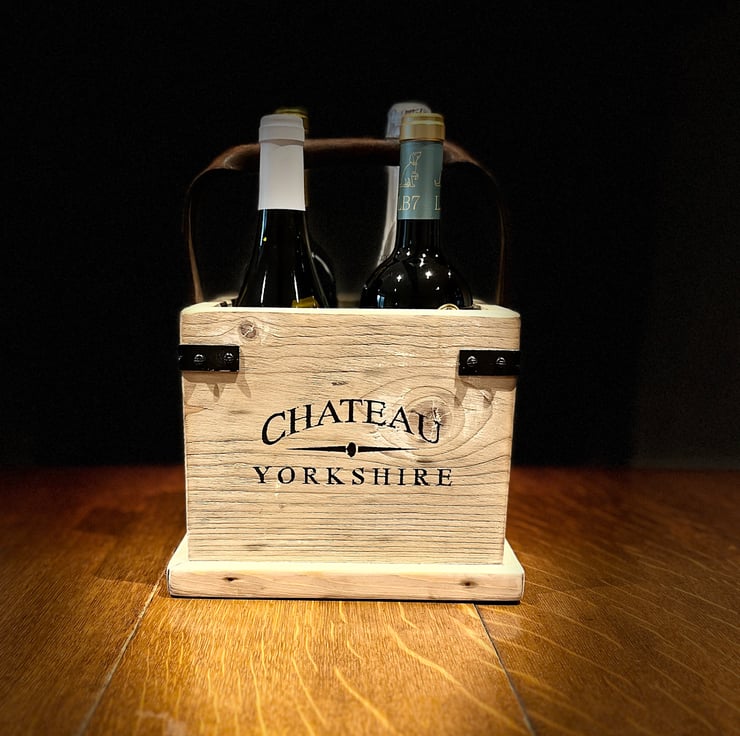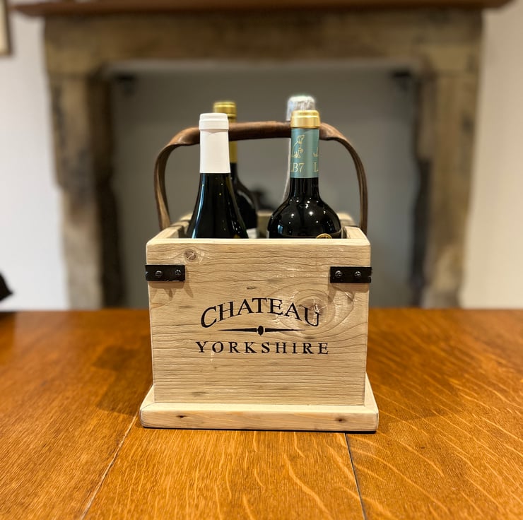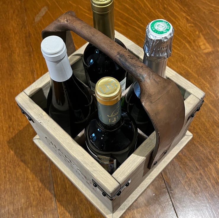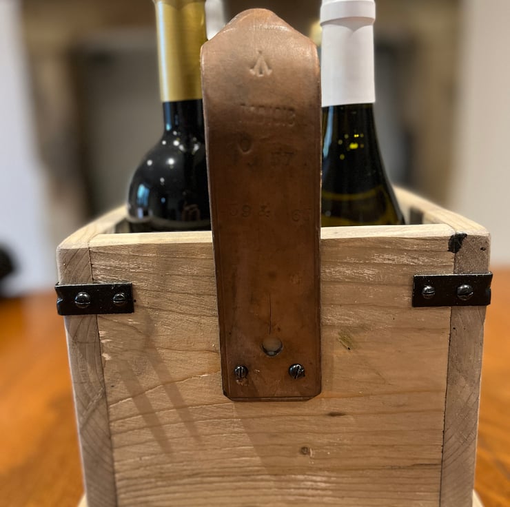 Once upon a time this was a discarded wood shelf. White painted and well worn it is now transformed into a rustic 4 bottle carrier for your wine. (Wine shown not included ).