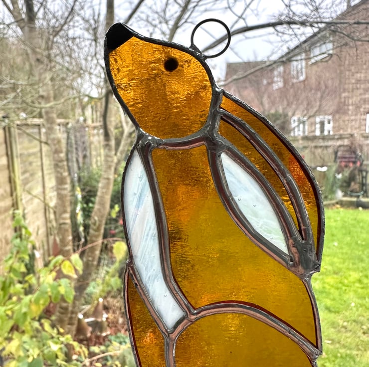 Each piece of glass has been hand cut, ground, washed, foiled and soldered together. before being washed again. The eye detail has been added with glass paint and the nose black patina. A ring has been attached for hanging purposes.