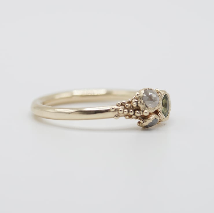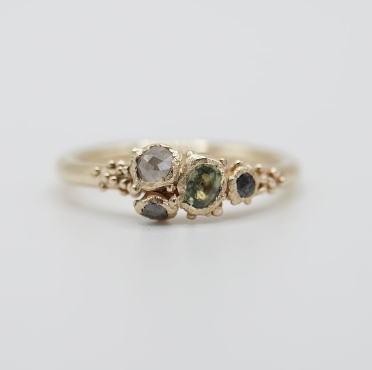 3 x 4mm Green Sapphire, 4mm white Rose cut Diamond, 3mm Salt & Pepper Diamond, 2mm Grey rose cut Diamond.