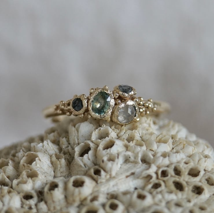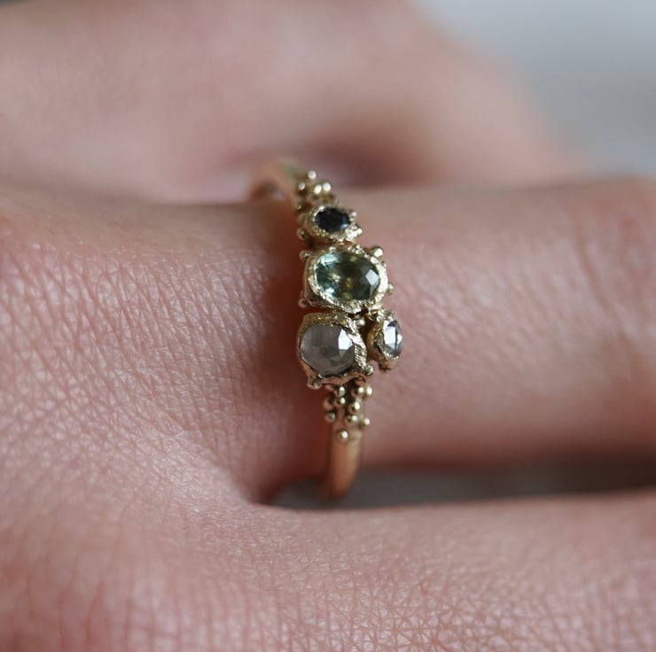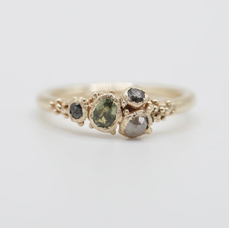 Named after Greek nereid Amatheia, this oceanic ring features a cluster of white, grey & salt and pepper diamonds surrounding a beautiful green Sapphire. All nestled within little seafoam granules.
