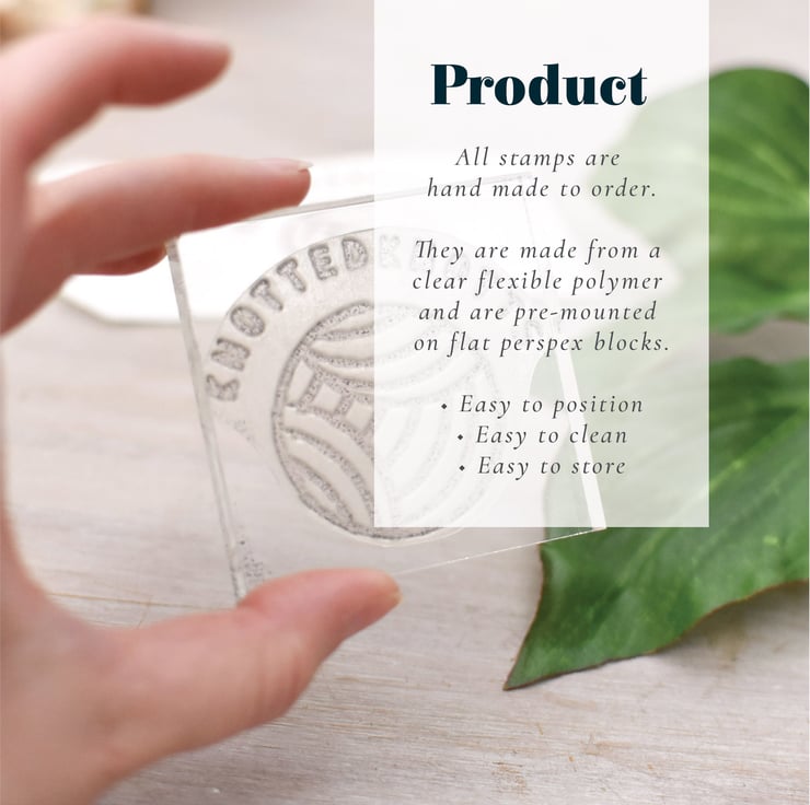 PRODUCT: The clear polymer stamp will be trimmed to the edge of the design and will be pre-assembled onto a clear acrylic mounting block for quick and easy stamping. Please be aware that this is NOT a wooden mounted stamp. All mounted stamps are supplied in a personalised linen storage bag with care card. If you do not require your stamp to be mounted please read the details at the end of description.