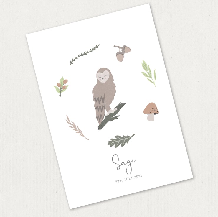 This owl print is a beautiful gender neutral gift for a new baby or to celebrate a special occasion such as a baptism, Christening or first birthday. The design features a cute baby owl illustration surrounded by a woodland leaf wreath to suit any nursery decor. You can customise the text underneath up to three lines, you could include a name, date or even a short message. This design is part of the British Woodland range, other animals are available as well as a matching fingerprint guest book print or personalised card. PLEASE NOTE: The fonts will be the same as shown in the sample, you do not have to specify any font choices.