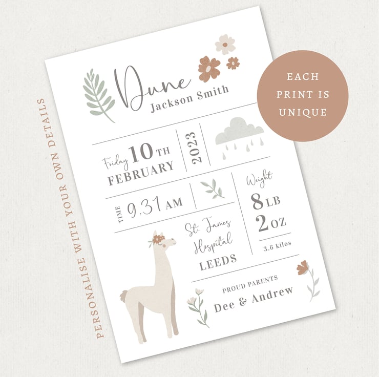 This Llama New Baby Print is an ideal as a keepsake to celebrate the birth of a baby. It is a modern gender neutral design and should fit with most nursery decor. It could also be used as a birth announcement and then displayed as framed nursery art or added to a baby scrapbook afterwards. The design layout will remain the same and you will need to provide the following details: Full name, DOB, time of birth, place of birth length at birth, first name of parents. If there are any sections you want to changeremove any details please contact before ordering to see if it is possible. This design is part of the baby stationery range, other animals are available as well as a matching name print or personalised card. PLEASE NOTE: The fonts will be the same as shown in the sample, you do not have to specify any font choices.