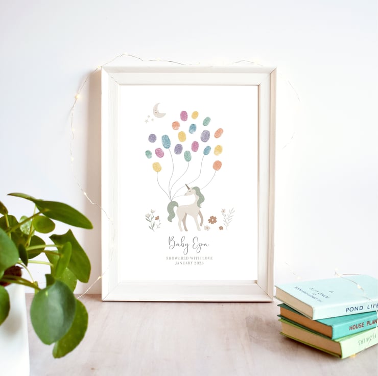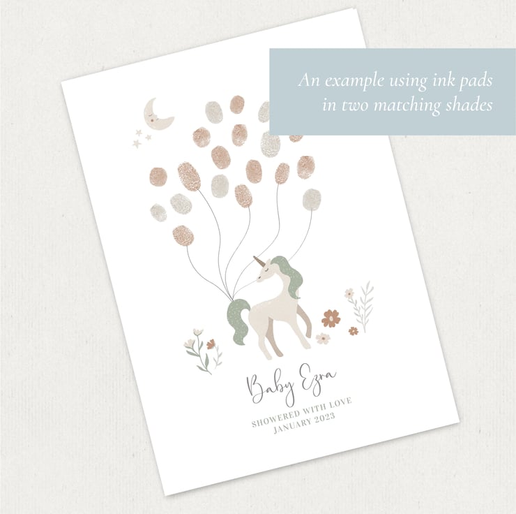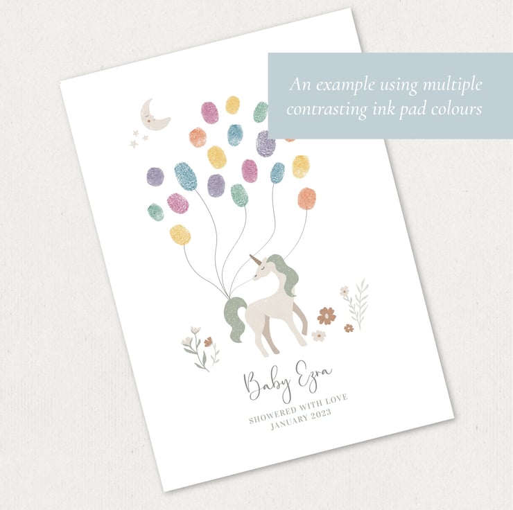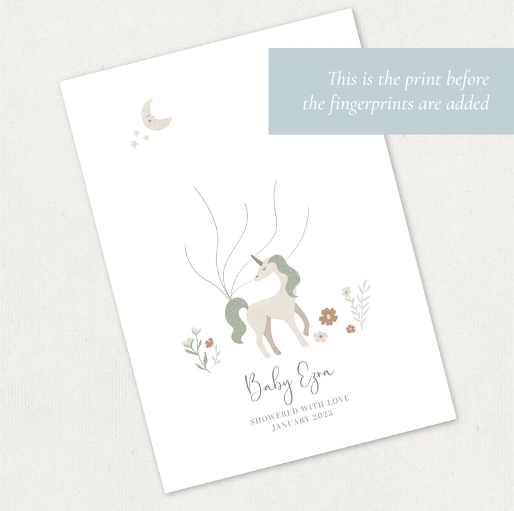 This Unicorn Fingerprint Guest Book Print is ideal as a keepsake from a baby shower or special occasion such as a Wedding or Christening. It makes a lovely alternative to a traditional fingerprint tree as it includes a unique illustration of a sleepy magical unicorn. You can customise the text underneath up to three lines, you could include a name, baby shower, date or location or a short message. The fingerprint area will be left blank so your guests can add their own using a regular ink pad in any colour or choice of colours, we have shown a couple of suggestions to inspire you. You can then frame the print as beautiful nursery art or add it to a baby scrapbook. This design is part of the baby stationery range, other animals are available as well as a matching name print or personalised card. PLEASE NOTE: The fonts will be the same as shown in the sample, you do not have to specify any font choices.