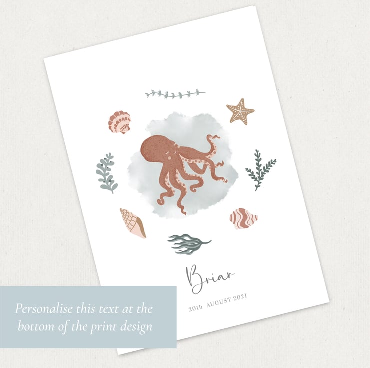 This Octopus Print is a beautiful gender neutral gift for a new baby or to celebrate a special occasion such as a baptism, Christening or first birthday. The design features a cute octopus illustration surrounded by a sea themed wreath to suit any nursery decor. You can customise the text underneath up to three lines, you could include a name, date or even a short message. This design is part of the Ocean range, other animals are available as well as a matching fingerprint guest book print or personalised card. PLEASE NOTE: The fonts will be the same as shown in the sample, you do not have to specify any font choices.