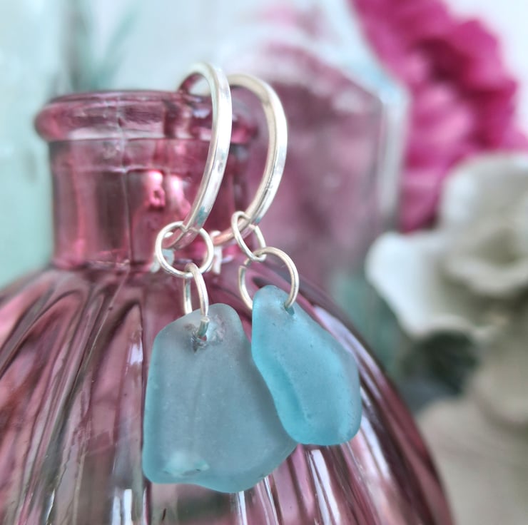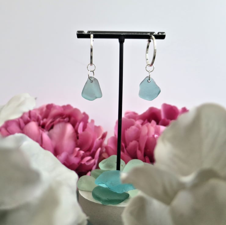 The sea glass hangs from 2cm (0.8in) sterling silver hoops and findings. The drop measures approx 4cm (1.5in) long. All sizes are approximate.